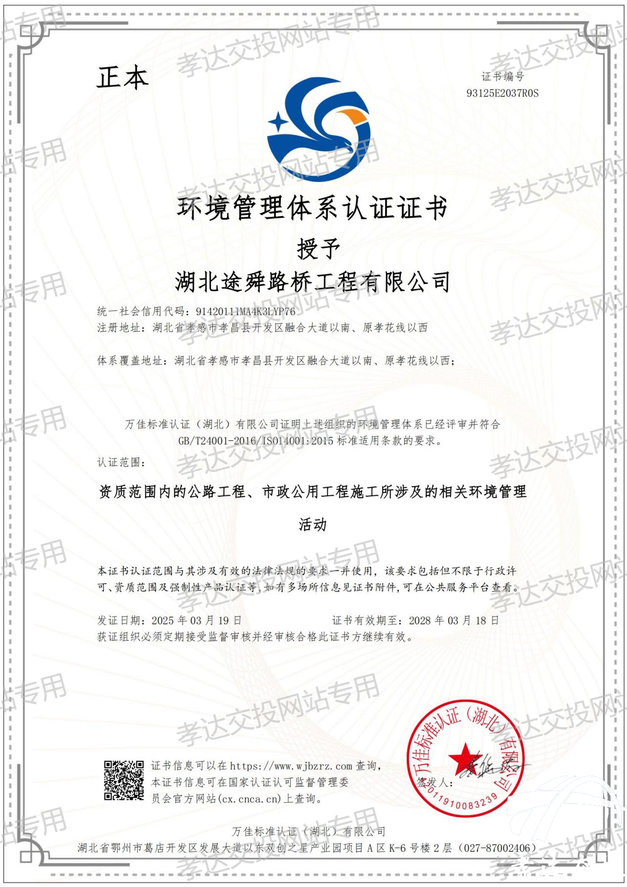 PA视讯官方网站子公司湖北途舜路桥工程有限公司通过三标管理体系认证