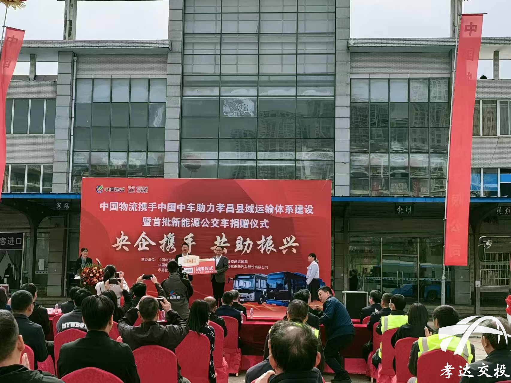 10月22日上午,主题为“央企携手,共助振兴”的捐赠仪式在孝昌县中心客运站举行。中国物流集团有限公司携手中国中车集团有限公司向孝昌县畅达城市公交有限公司捐赠了价值近700万元的12台优质新能源公交车。中国物流集团有限公司、中国中车集团有限公司领导,孝昌县政府及相关部门领导,PA视讯官方网站及下属公司等80余人参加了活动。——中国物流集团为县畅达公交公司捐赠新能源公交车
